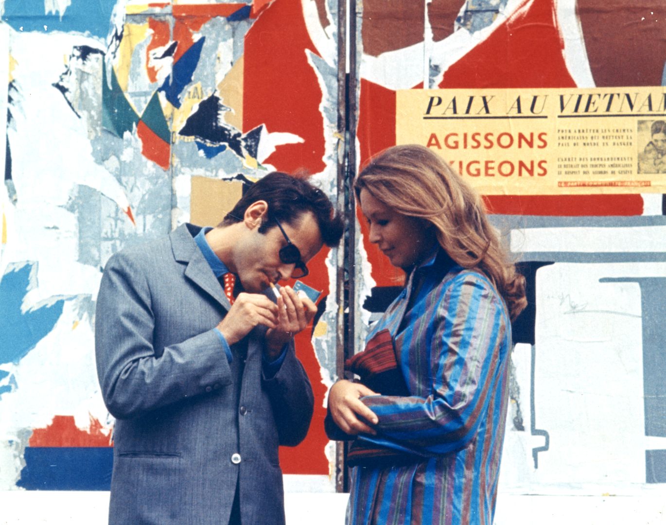 Sein Vorgehen versteht Godard jedenfalls als das Gegenteil einer Schleichwerbung (die Schleichwerbung nennt sich dieser Tage product placement oder #werbung, sie wird konsumiert wie ein oder ihr eigenes Produkt), also so, dass wir die Produkte vor die Nase gehalten bekommen, sie uns aber nicht verkauft werden, sondern dass wir eher über ihre Präsenz in unserem Leben an sich oder die Art und Weise, in der sie uns gezeigt werden, nachdenken. Wir genießen die angenehm farbigen Oberflächen des Films, die schönen Menschen, die in existenzialistischen Posen und doch mit der Leichtigkeit eines Löffels in einer Tasse Kaffee an ihrem Dasein rühren, aber wir merken, dass etwas nicht stimmt. Wir hinterfragen die Verlockung, während sie uns ansieht. Das ist ein bisschen, als würde wir uns beim Flirt der Schwächen des Gegenübers bewusst oder aber, als würden wir uns in wen verlieben, den wir als Betrüger durchschauen. Die erste Variante ist Utopie einer Selbstbestimmung, die zweite Variante ist Realismus.